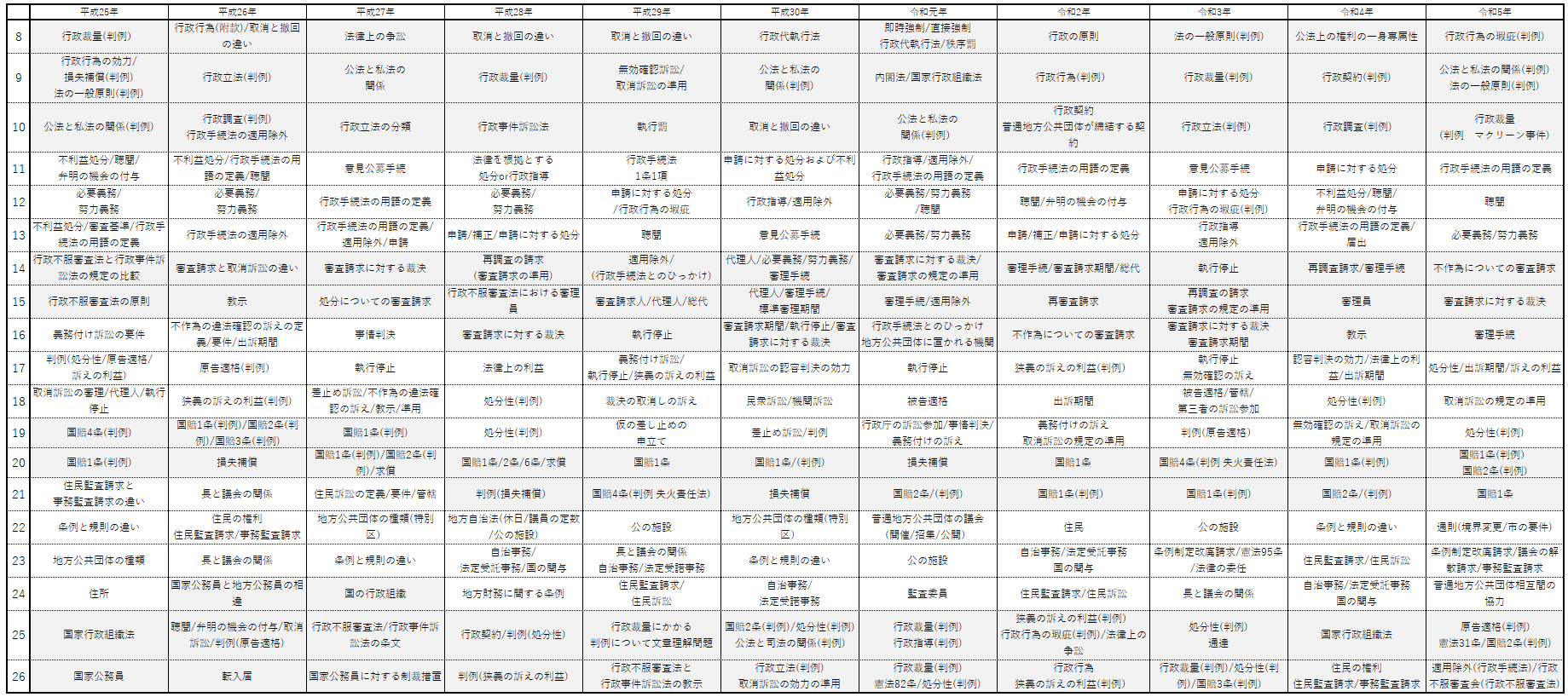 平成25年から令和5年までの11年分の過去問のキーワードを整理したものです。