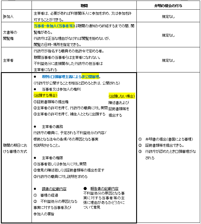 こちらは私が自分で作成した「聴聞」と「弁明の機会」の付与の違いを比較した表です。